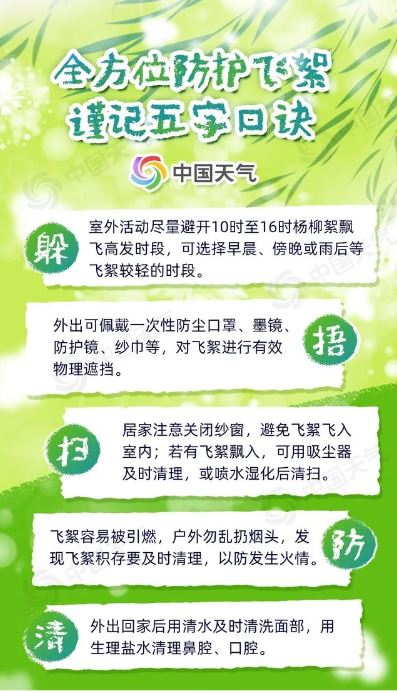 隨風(fēng)飄散的飛絮可能會攜帶花粉、粉塵等物質(zhì)入侵人體呼吸道,引發(fā)皮膚或呼吸系統(tǒng)的過敏癥狀,且楊柳絮屬于易燃物,遇到明火會迅速燃燒蔓延,甚至引燃其他可燃物,釀成火災(zāi)。記住五字口訣,全方位防護(hù)擾人的“四月雪”。