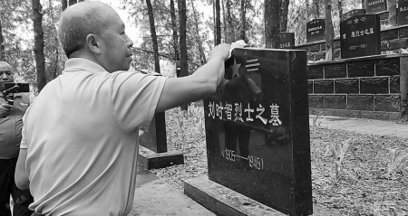 長(zhǎng)子獨(dú)立團(tuán)團(tuán)長(zhǎng)劉時(shí)智烈士的墓碑前,來(lái)自湖北省紅安縣華河鎮(zhèn)大學(xué)村的劉正業(yè)捧著從家鄉(xiāng)帶來(lái)的水和土,淚流滿面,反復(fù)說(shuō)著“侄子不孝,現(xiàn)在才找到您,這么晚才來(lái)看您?!?/p>