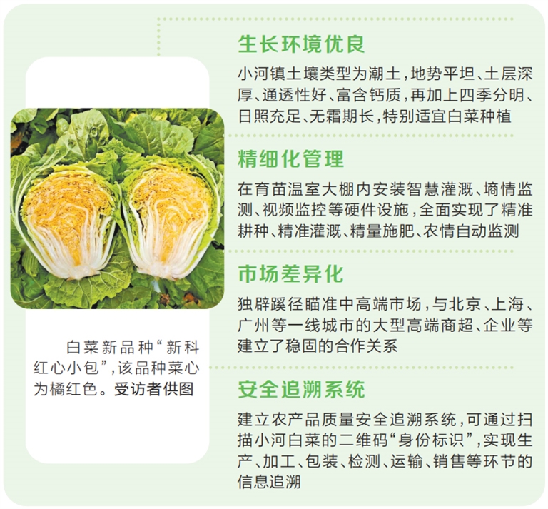 “小河白菜跳出‘白菜價’,我們最大的底氣便是好的品種培育?!本G源農(nóng)牧總經(jīng)理張躍民介紹,他從2008年開始流轉(zhuǎn)600余畝土地規(guī)?;N植小河白菜,品種大部分來自新鄉(xiāng)市農(nóng)科院蔬菜研究團(tuán)隊(duì)。往年該公司主要種植的白菜品種為“新科小包26”,一棵也能賣到39元。