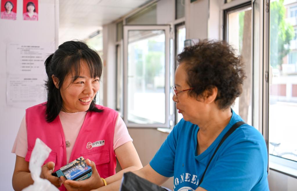 在天津市河西區(qū)賓西樓居家養(yǎng)老服務中心,劉緩緩(左)為老人辦理業(yè)務時與老人聊家常。新華社記者 孫凡越 攝