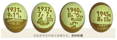 該系列作品遴選了“九一八事變”“七七盧溝橋事變”“百團大戰(zhàn)”等12例抗戰(zhàn)歷史事件作為蛋雕素材,經(jīng)過20余天的構(gòu)思與精雕細刻,岳利民讓他的“家國情懷”成為了國家記憶的一部分。
