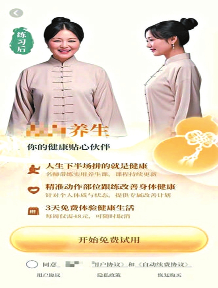 還有些App則更加離譜,下載完成后,點進去的第一步就是要購買會員,之后才能正常使用。但在購買流程上,平臺卻耍起了花招。比如一款提供“養(yǎng)生指導服務”的App,頁面上會有一個大大的按鈕,寫著“開始免費試用”。但在按鈕的旁邊,卻有一行非常不起眼的小字:“每周僅需48元,可隨時取消?!倍坏┯脩酎c擊開始試用,系統(tǒng)就會跳轉(zhuǎn)到自動續(xù)費的開通界面。如果是辨別能力差的老人,可能還以為是在填寫什么注冊信息。