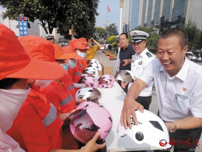 今年是我市創(chuàng)建全國文明城市的決戰(zhàn)決勝年,廣大環(huán)衛(wèi)工人一直默默奮斗在崗位上,為我市創(chuàng)文不斷努力。市公安局交警支隊始終牽掛著奮戰(zhàn)在基層一線的環(huán)衛(wèi)工人,支隊以此次贈送頭盔活動為契機(jī),持續(xù)關(guān)心關(guān)愛環(huán)衛(wèi)工人的生命安全和身體健康。市公安局交警支隊負(fù)責(zé)人表示:“環(huán)衛(wèi)工人大多騎著電動三輪車或人力保潔車穿梭在大街小巷,機(jī)動車道是他們的主要作業(yè)區(qū)之一,佩戴安全頭盔,可以大大增加他們的安全系數(shù)。同時,環(huán)衛(wèi)等重點(diǎn)行業(yè)的示范引領(lǐng)作用,將有力帶動市民遵紀(jì)守法、安全出行,為文明城市創(chuàng)建打造一道亮麗的風(fēng)景線?!眻D為捐贈活動現(xiàn)場。張志遠(yuǎn) 攝影報道