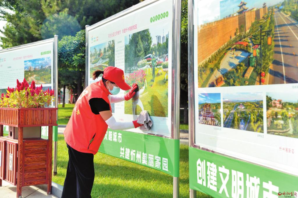 9月9日,市園林服務(wù)中心的志愿者正在忻州城區(qū)體育廣場清潔宣傳欄。眼下正處于創(chuàng)建全國文明城市的攻堅(jiān)階段,忻州市各單位的志愿者紛紛走上街頭、廣場、小區(qū),為創(chuàng)文助力。 張存良 攝