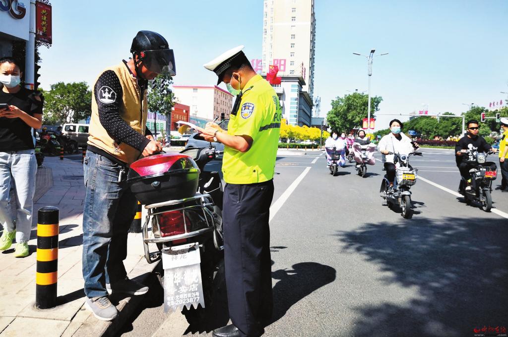 個別市民為了搶幾十秒時間,少走幾百米路,騎電動車闖紅燈、逆行,結(jié)果收到交警的罰單。5月27日,在城區(qū)建設(shè)路與長征街路口,執(zhí)勤交警一邊開罰單,一邊苦口婆心地勸說交通違法者:“為了自己和他人的安全,一定要遵守交通法規(guī),摒棄交通陋習(xí),遠(yuǎn)離交通事故?!保ㄓ浾?張劍雄 攝)