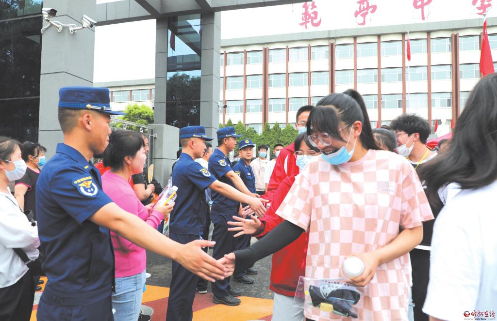 6月7日,全國高考開考,原平市2670名考生走進(jìn)考場,經(jīng)歷人生中的一次大考。考生在考場上認(rèn)真答卷,社會各界營造良好的考試環(huán)境,為考生保駕護(hù)航。圖為在原平市范亭中學(xué)考點,考生完成首場考試后走出考場,消防救援工作人員與他們擊掌,為他們鼓勁加油。(褚 震 攝)