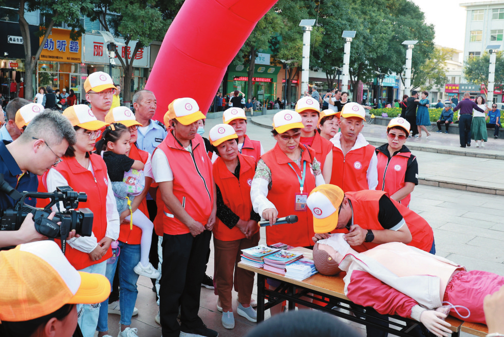 活動現(xiàn)場,志愿者為市民講解急救知識,發(fā)放關(guān)于消防安全和急救方法的書籍、手冊,同時對心肺復(fù)蘇和手臂骨折、頭部、胸部以及大腿包扎、頸椎骨折等進(jìn)行現(xiàn)場處理,同時對搬運護(hù)送原則及方法進(jìn)行講解、演示。
