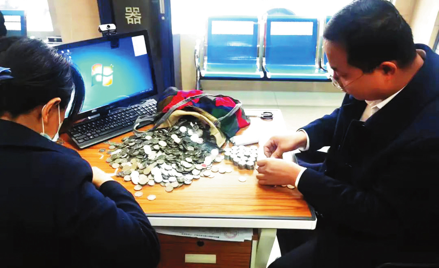 該行行長閆俊斌聞訊前來,迅速與同事們一起展開清點工作,一邊碼硬幣一邊與老大爺談心聊天……得知大爺是小砂村人,天黑之前還要趕路回家,工作人員更是加快了清點的節(jié)奏。不到一小時,3459枚硬幣清點、捆扎、兌換完成,拿到紙幣的大爺很是高興,直夸農(nóng)商行的服務態(tài)度好、工作效率高。