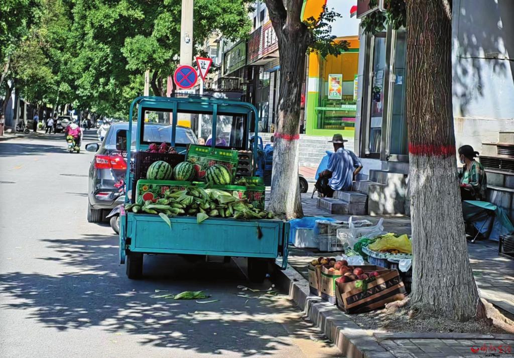 近日,記者在城區(qū)多條街巷發(fā)現(xiàn),大多數(shù)商販都能守法經(jīng)營(yíng),整齊有序擺放商品。然而,仍有個(gè)別商販占道經(jīng)營(yíng),對(duì)市容環(huán)境造成影響。圖為7月7日上午,城區(qū)氣象北巷一家蔬菜店把蔬菜擺放在門(mén)前的人行道上、把拉運(yùn)玉米的三輪車停放在馬路上叫賣,玉米皮隨地亂扔,嚴(yán)重妨礙了通行秩序。(記者張志遠(yuǎn)攝)