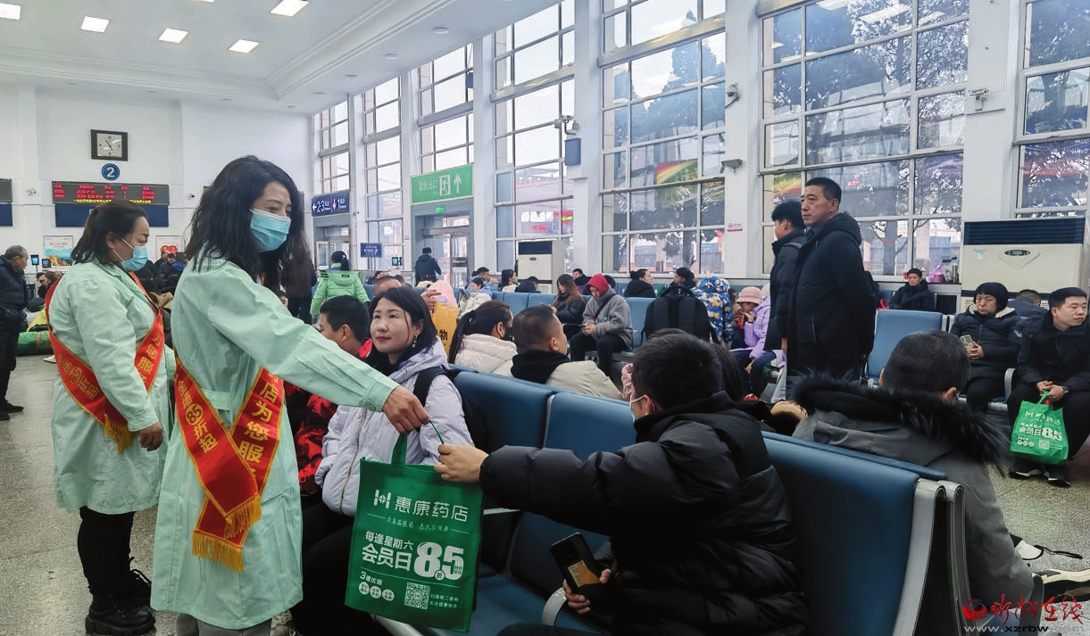 近日,國內知名藥企廣州白云山和記黃埔中藥有限公司攜手我市當?shù)厮幤箝_展春運愛心公益活動。圖為工作人員在忻州火車站向候車乘客發(fā)放防流感藥品、口罩等健康禮包。(李建中攝)