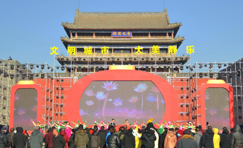 在北城門樓廣場的歌舞現(xiàn)場,二人臺對唱《拜大年》、歌曲《復(fù)興的力量》《牽著春風(fēng)進(jìn)山村》、舞蹈《幸福中國一起走》、北路梆子《黃河管子聲》選段等精彩的節(jié)目陸續(xù)登臺,贏得廣大市民朋友的陣陣掌聲。