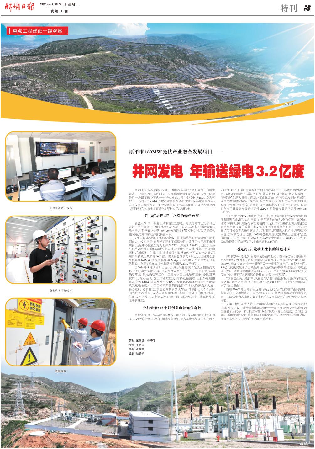 “項(xiàng)目攻堅(jiān)階段,正值原平氣候多變,雨多霧大的時(shí)節(jié),為保障目標(biāo)任務(wù)圓滿完成,團(tuán)隊(duì)以時(shí)不我待、只爭朝夕的勁頭,全力克服山高路險(xiǎn)、地勢不平的困難,在保障安全的前提下,緊盯節(jié)點(diǎn),倒排工期,積極推進(jìn)光伏片運(yùn)輸安裝等關(guān)鍵工作,為項(xiàng)目全容量并網(wǎng)爭取到了寶貴的時(shí)間。”項(xiàng)目部負(fù)責(zé)人楊亞賽介紹。項(xiàng)目團(tuán)隊(duì)運(yùn)用無人機(jī)巡檢、智能監(jiān)控平臺(tái),實(shí)時(shí)掌控場區(qū)動(dòng)態(tài)。2025年盛夏來臨,這里的荒山已變身“藍(lán)色能源?!?。58個(gè)光伏方陣通過6回35kV集電線路匯入220kV升壓站,再經(jīng)輸送線直供經(jīng)濟(jì)開發(fā)區(qū),年輸送綠電3.2億度。