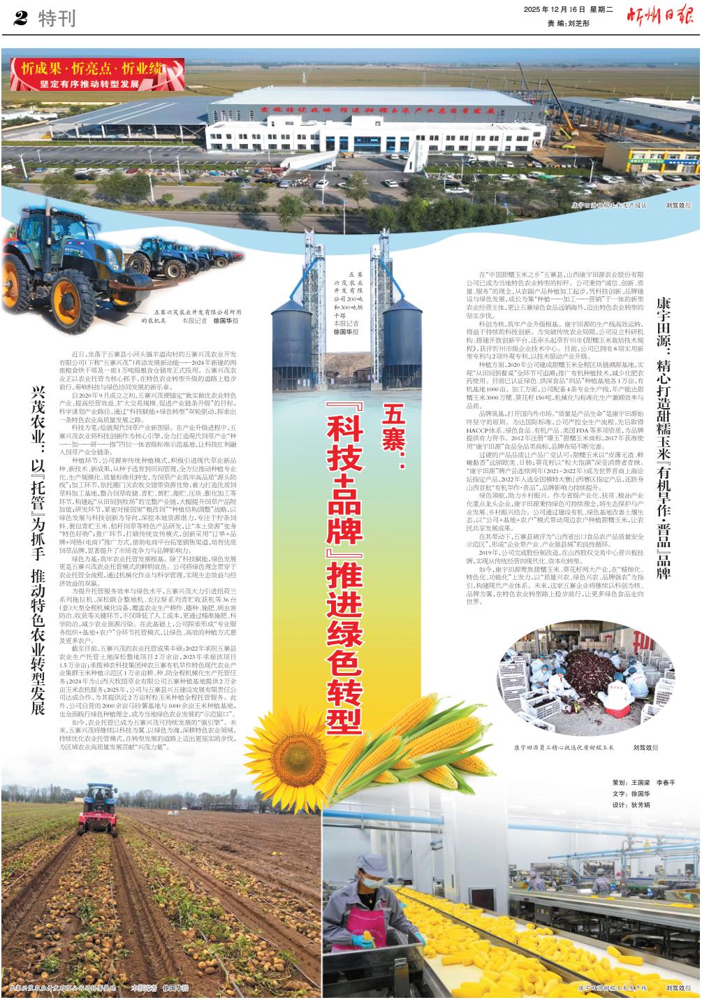 在“中國甜糯玉米之鄉(xiāng)”五寨縣,山西康宇田源農(nóng)業(yè)股份有限公司已成為當(dāng)?shù)靥厣r(nóng)業(yè)轉(zhuǎn)型的標(biāo)桿。公司秉持“誠信、創(chuàng)新、質(zhì)量、服務(wù)”的理念,從農(nóng)副產(chǎn)品種植加工起步,憑科技創(chuàng)新、品牌建設(shè)與綠色發(fā)展,成長為集“種植——加工——營銷”于一體的新型農(nóng)業(yè)經(jīng)營主體,更讓五寨綠色食品遠(yuǎn)銷海外,邁出特色農(nóng)業(yè)轉(zhuǎn)型的堅實步伐。