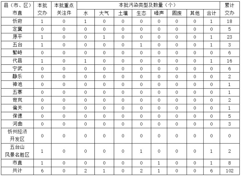 截至6月22日,中央第一生態(tài)環(huán)境保護(hù)督察組累計(jì)向我市交辦信訪件102件,其中重點(diǎn)關(guān)注件6件。交辦的信訪件中,涉及原平市23件、忻府區(qū)18件、代縣16件、市直單位8件、繁峙縣6件、寧武縣6件、定襄縣5件、保德縣5件、五臺(tái)縣3件、河曲縣3件、靜樂(lè)縣2件、岢嵐縣2件、五臺(tái)山風(fēng)景名勝區(qū)2件、五寨縣1件、偏關(guān)縣1件、神池縣1件;涉及生態(tài)環(huán)境問(wèn)題102個(gè),其中生態(tài)破壞問(wèn)題24個(gè)、大氣污染問(wèn)題19個(gè)、土壤污染問(wèn)題17個(gè)、其他污染問(wèn)題15個(gè)、噪聲污染問(wèn)題14個(gè)、水污染問(wèn)題13個(gè)。
