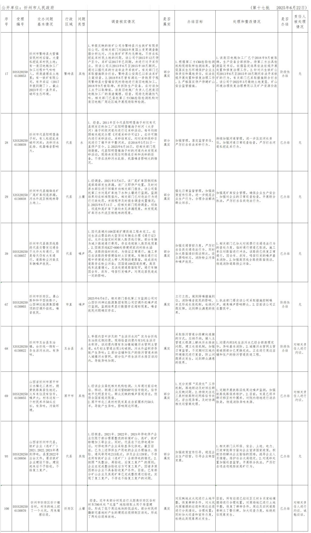中央生態(tài)環(huán)境保護督察組群眾信訪舉報轉辦和邊督邊改公開情況一覽表(第十七批)
