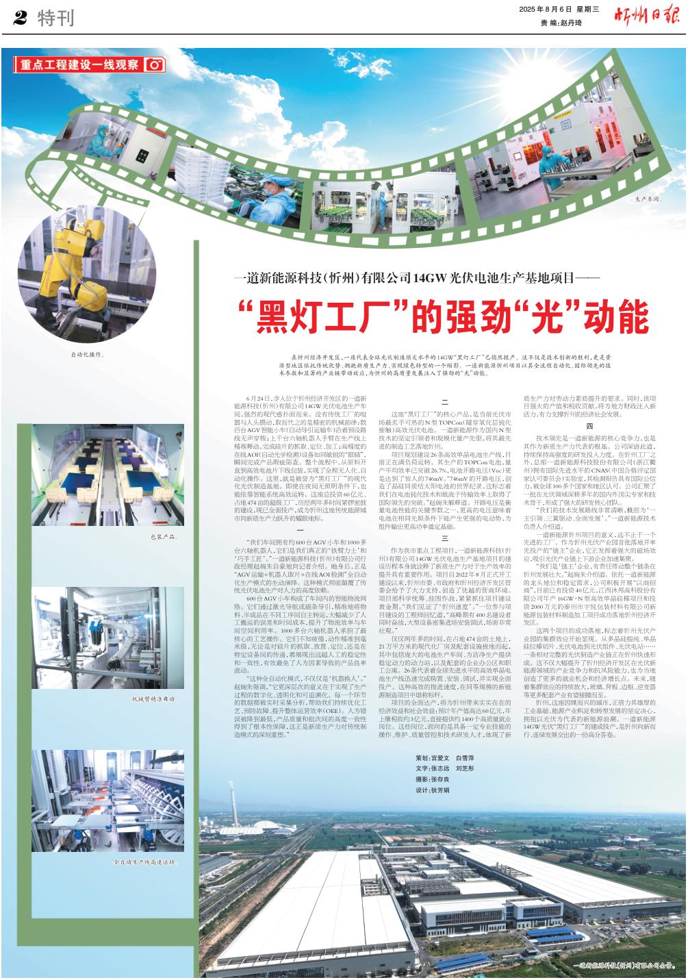 6月24日,步入位于忻州經(jīng)濟(jì)開(kāi)發(fā)區(qū)的一道新能源科技(忻州)有限公司14GW光伏電池生產(chǎn)車(chē)間,強(qiáng)烈的現(xiàn)代感撲面而來(lái)。沒(méi)有傳統(tǒng)工廠(chǎng)的喧囂與人頭攢動(dòng),取而代之的是精密的機(jī)械韻律:數(shù)百臺(tái)AGV智能小車(chē)(自動(dòng)導(dǎo)引運(yùn)輸車(chē))沿著預(yù)設(shè)路線(xiàn)無(wú)聲穿梭;上千臺(tái)六軸機(jī)器人手臂在生產(chǎn)線(xiàn)上精準(zhǔn)舞動(dòng),完成硅片的抓取、定位、加工;高精度的在線(xiàn)AOI(自動(dòng)光學(xué)檢測(cè))設(shè)備如同敏銳的“眼睛”,瞬間完成產(chǎn)品瑕疵篩查。整個(gè)流程中,從原料開(kāi)盒到高效電池片下線(xiàn)包裝,實(shí)現(xiàn)了全程無(wú)人化、自動(dòng)化操作。這里,就是被譽(yù)為“黑燈工廠(chǎng)”的現(xiàn)代化光伏制造基地。即使在夜間無(wú)照明條件下,也能依靠智能系統(tǒng)高效運(yùn)轉(zhuǎn)。這座總投資60億元、占地474畝的超級(jí)工廠(chǎng),歷經(jīng)兩年多時(shí)間緊鑼密鼓的建設(shè),現(xiàn)已全面投產(chǎn),成為忻州這座傳統(tǒng)能源城市向新質(zhì)生產(chǎn)力躍升的耀眼地標(biāo)。