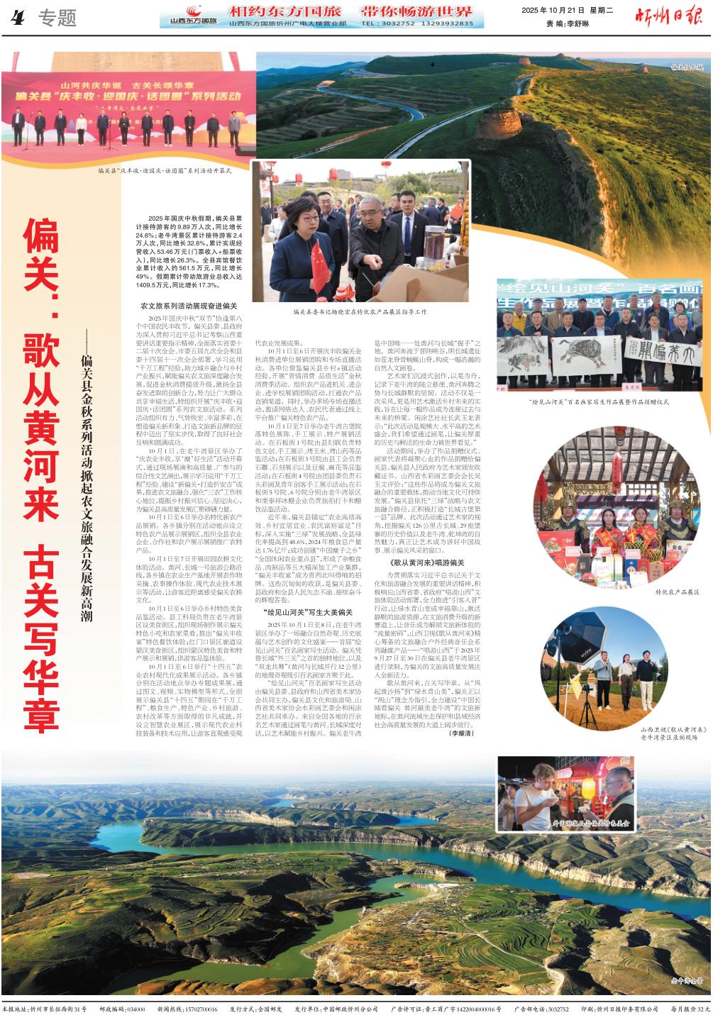歌從黃河來(lái),古關(guān)寫華章。從“風(fēng)起黃沙揚(yáng)”到“綠水青山美”,偏關(guān)正以“兩山”理念為指引,全力建設(shè)“中國(guó)長(zhǎng)城看偏關(guān)黃河最美老牛灣”的文旅新地標(biāo),在黃河流域生態(tài)保護(hù)和縣域經(jīng)濟(jì)社會(huì)高質(zhì)量發(fā)展的大道上闊步前行。(李耀清)