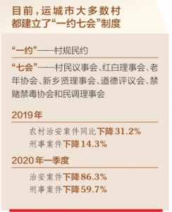 目前,運城市大多數(shù)村都建立了“一約七會”制度——“一約”是村規(guī)民約,“七會”是村民議事會、紅白理事會、老年協(xié)會、新鄉(xiāng)賢理事會、道德評議會、禁賭禁毒協(xié)會和民調(diào)理事會。這“一約七會”制度的不斷健全,對破除鄉(xiāng)村社會陋習(xí)、引導(dǎo)群眾移風(fēng)易俗、引領(lǐng)社會新風(fēng)、化解矛盾糾紛,維護基層社會和諧穩(wěn)定起到了重要作用。村民的正能量多了,鄉(xiāng)村的負(fù)面事情少了,社會治安狀況得到明顯改善,群眾安全感顯著增強。2019年運城市農(nóng)村治安案件同比下降31.2%,刑事案件下降14.3%;2020年一季度,治安案件下降86.3%,刑事案件下降59.7%。