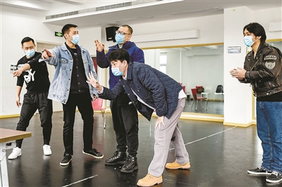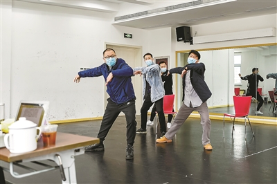 雖然疫情正在向好,但防控的弦還不能就此放松下來(lái)。整個(gè)藝苑大樓彌漫著消毒水的味道,演員們都戴著口罩,分散在排練廳、會(huì)議室、演員隊(duì)等各個(gè)角落進(jìn)行排練。