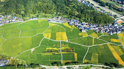 今夏,湖南省懷化市溆浦縣北斗溪鎮(zhèn)坪溪村三百稻田中的“鄉(xiāng)村振興”和小橋流水圖案引人矚目。雷文錄 攝(人民圖片)