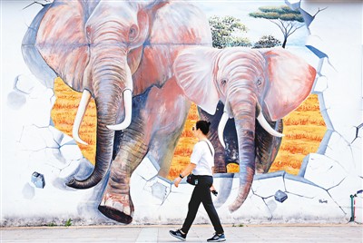 游客行走在安徽省合肥市廬江縣湯池鎮(zhèn)果樹村文化廣場藝術畫前。王閩 攝(人民圖片)