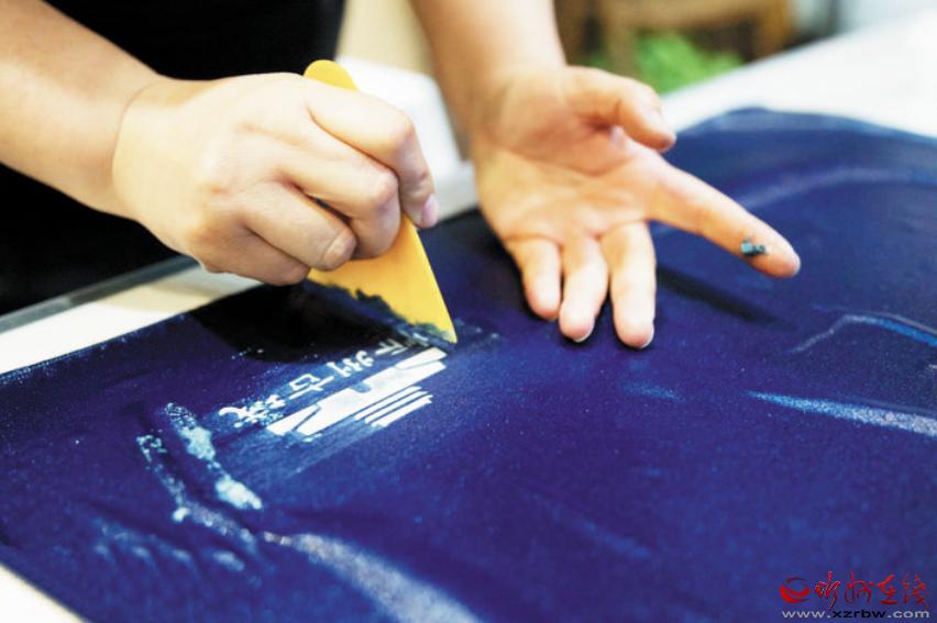 灰纈的最后一步是刮漿。由于灰漿的保護,設(shè)計好的圖案得以在染好的布料上被保留下來,形成好看的圖樣及花式。