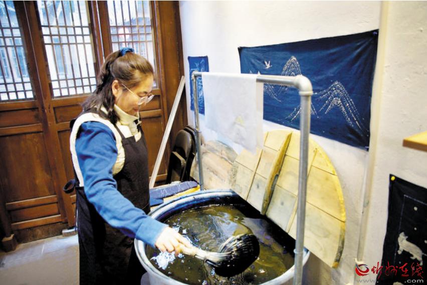 “染缸是我最寶貝的東西。我對它就像對待孩子,不能冷著、熱著、累著、餓著?!壁w慧說,天然染料的缸需要“養(yǎng)”,冬天冷了烤暖氣,夏天熱了吹空調(diào),還要不時添加?xùn)|西,“這個缸我‘養(yǎng)’了四年多,叫它‘藍寶寶’。”