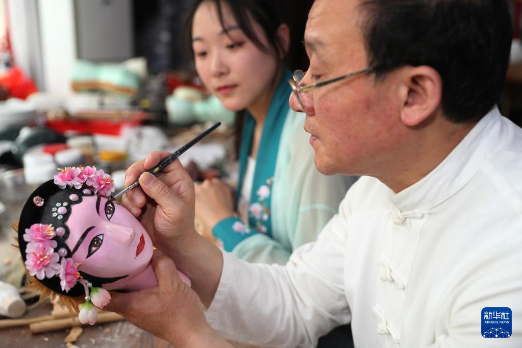 5月21日,在山東青島,姜玉濤給徒弟教授木偶勾臉技藝。