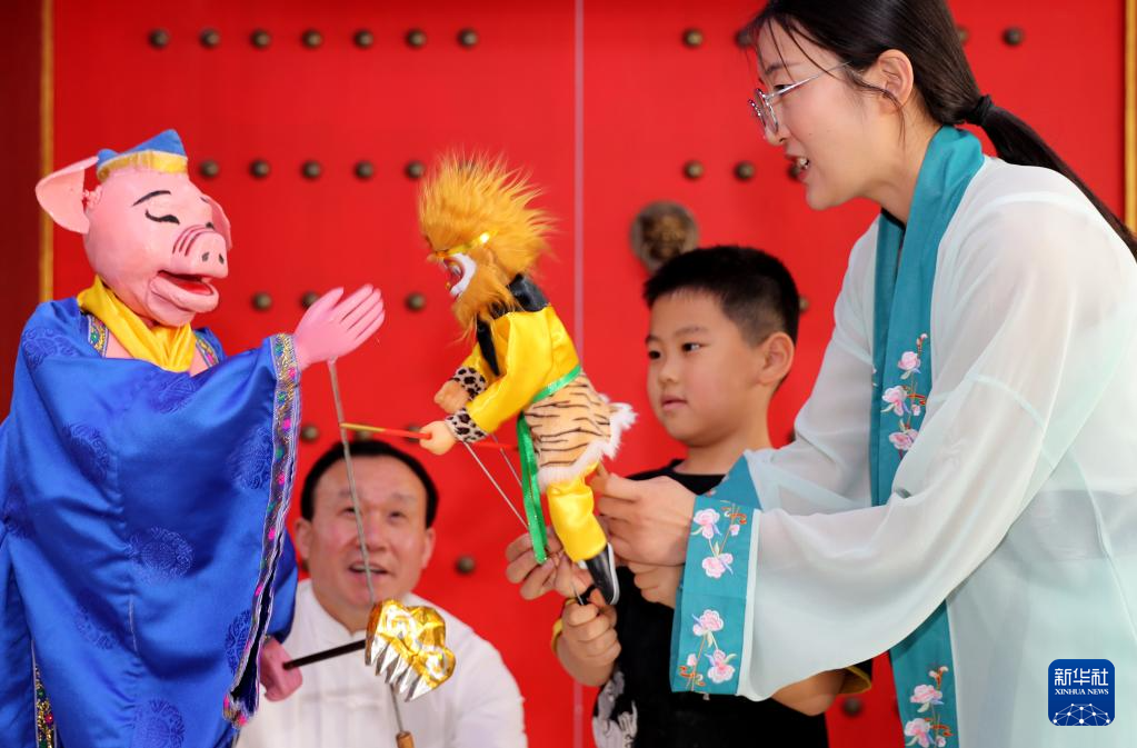 5月21日,在山東青島,萊西木偶藝術(shù)團(tuán)的演員給小朋友演示木偶戲表演技巧。