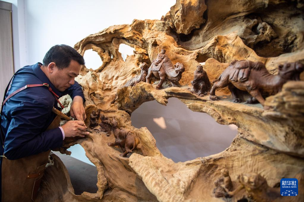 5月23日,在洞口縣巖山鎮(zhèn)陽(yáng)家山村,洞口木雕非遺傳承人傅立先在創(chuàng)作木雕作品《絲綢之路》。