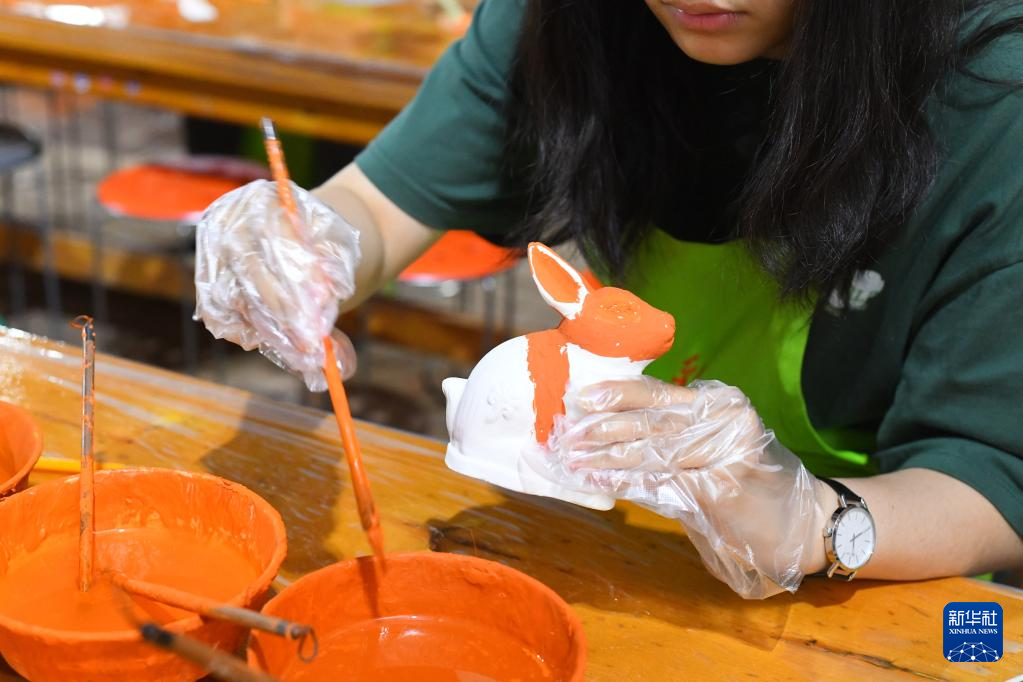 6月6日,一名體驗者在唐三彩文化研學(xué)所為唐三彩素胎施釉。