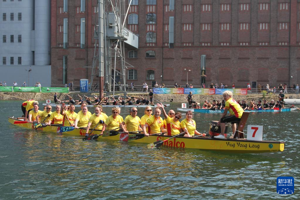 6月10日,人們?cè)诘聡?guó)杜伊斯堡參加趣味龍舟賽。新華社記者 單瑋怡 攝?