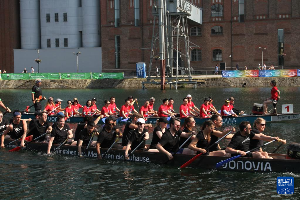 6月10日,人們?cè)诘聡?guó)杜伊斯堡參加趣味龍舟賽。新華社記者 單瑋怡 攝