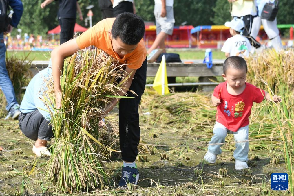 9月23日,在北京市海淀區(qū)上莊鎮(zhèn)西馬坊京西稻田,小朋友在活動(dòng)中參加割稻子比賽。