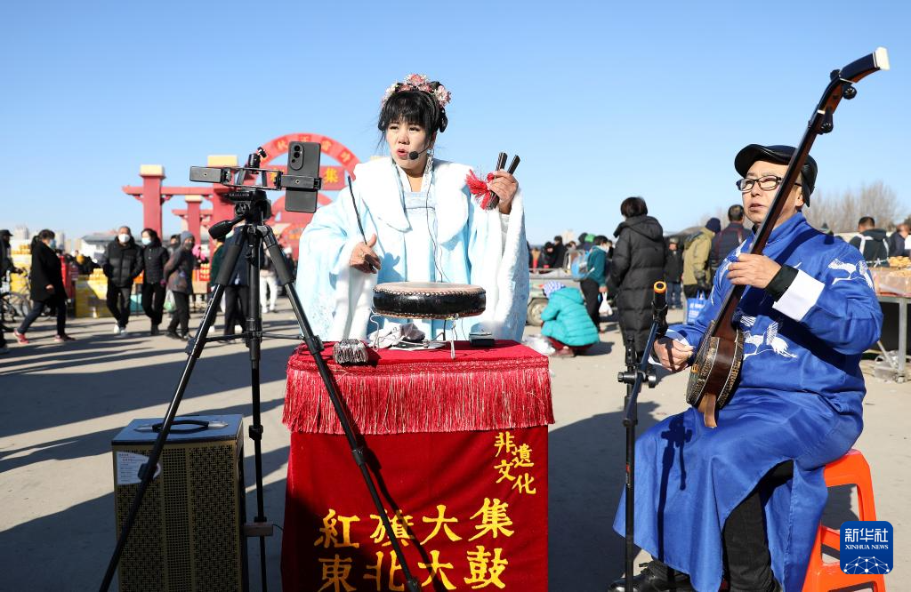 11月28日,東北大鼓非物質(zhì)文化遺產(chǎn)傳承人王艷娟(左)在紅旗大集上表演。
