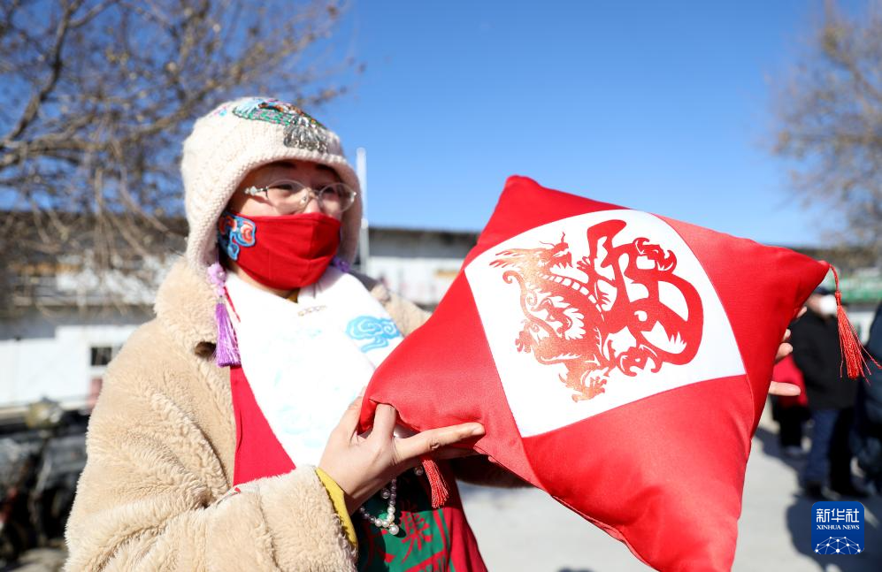 11月28日,一名手工藝人在紅旗大集展示她制作的剪紙抱枕。