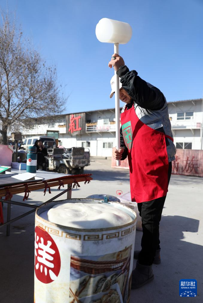 11月28日,一名商販在紅旗大集展示打糕。