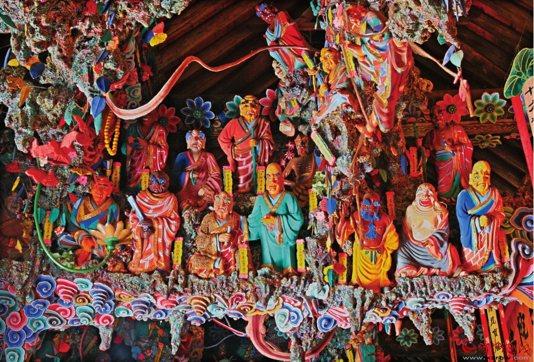 金閣寺現(xiàn)存的寺廟建筑及塑像,均在明、清、民國復修。寺廟坐北向南,占地面積2.l萬平方米,呈正方形。穿牌坊,登臺階,進天王殿,殿檐下掛著題有“金閣寺”的大匾。在第一處大院中間,矗立一座大閣,內(nèi)供高17.7米的千手(實為48臂)觀音銅像,這是五臺山最高最大的圣像。像原本為銅鑄,造于明嘉靖四年(1525年),后人重修該寺時,為使觀音更加中性化,便在銅像外面貼泥、金妝,從肩膀兩旁伸出許多胳膊,手執(zhí)各種兵器,加成了48臂,顯得異常威武,號千手觀音。殿閣內(nèi),左右后柱兩個1米高的石柱礎(chǔ),為圓形中間束腰上下卷蓮瓣形,是唐代遺物。