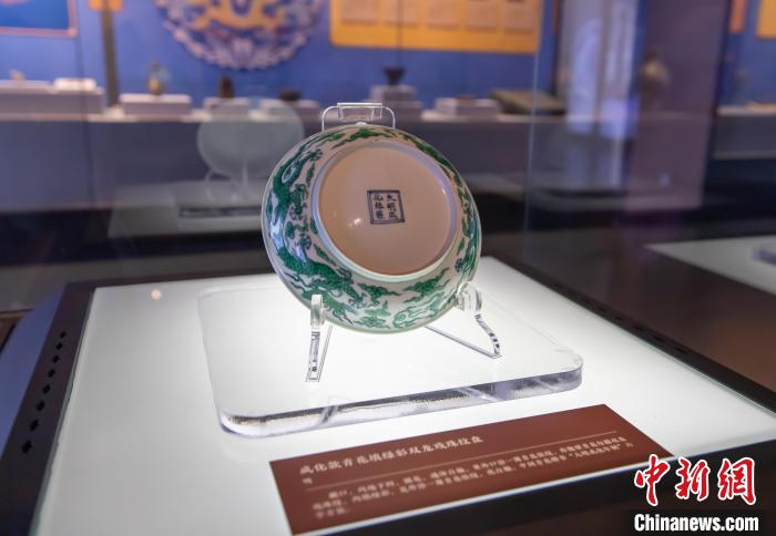 圖為展品國(guó)家一級(jí)文物成化款青花填綠彩雙龍戲珠紋盤(明)。王在御 攝