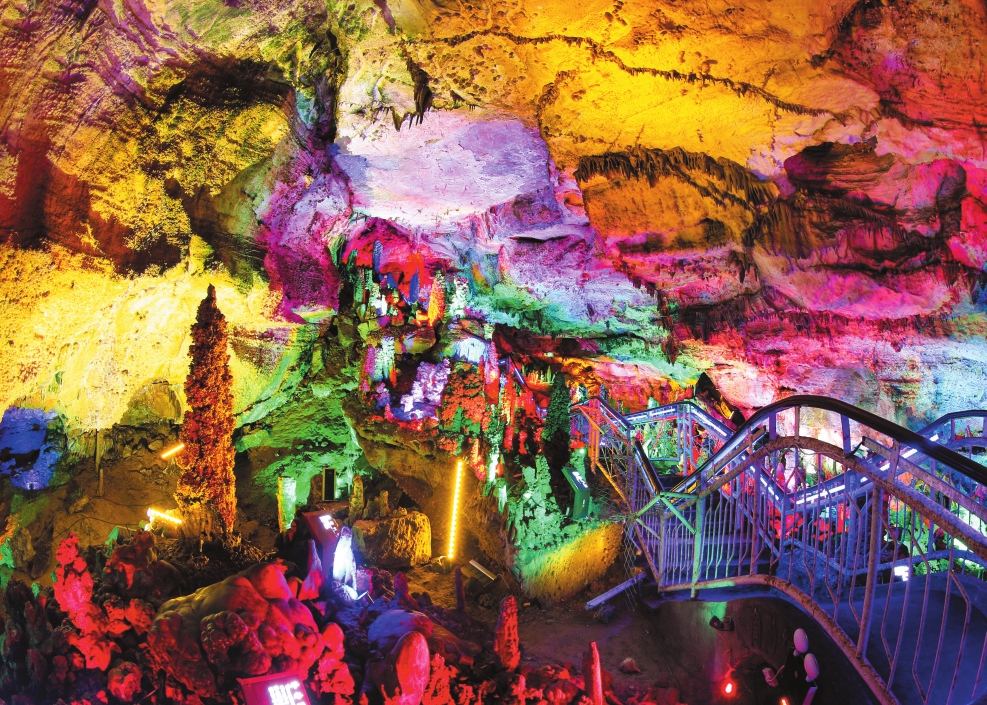 游客沿著精心設(shè)計的路線,可觀賞50多個景點。其中“群獅迎賓”,洞口一組石筍形似雄獅列隊,栩栩如生;“金龜出洞”,巨石形成的龜狀奇石,仿佛正探秘人間;“瑤池仙境”與“蓬萊仙島”,燈光下的石幔如天宮云霞;“鎮(zhèn)海寶塔”,高1.8米的花團狀石塔,景象奇麗。最令人驚嘆的是洞內(nèi)的“冰瀑世界”。在水晶洞和一線天區(qū)域,巖溶從洞頂傾瀉而下,形成各種瀑布奇觀:有如長白山瀑布的白練懸空,有如黃果樹瀑布的氣勢恢宏,還有黃巖大瀑布的玲瓏剔透。一處名為“禹王觀瀑”的景點,更讓游人仿佛看見大禹治水時三過家門而不入的身影。