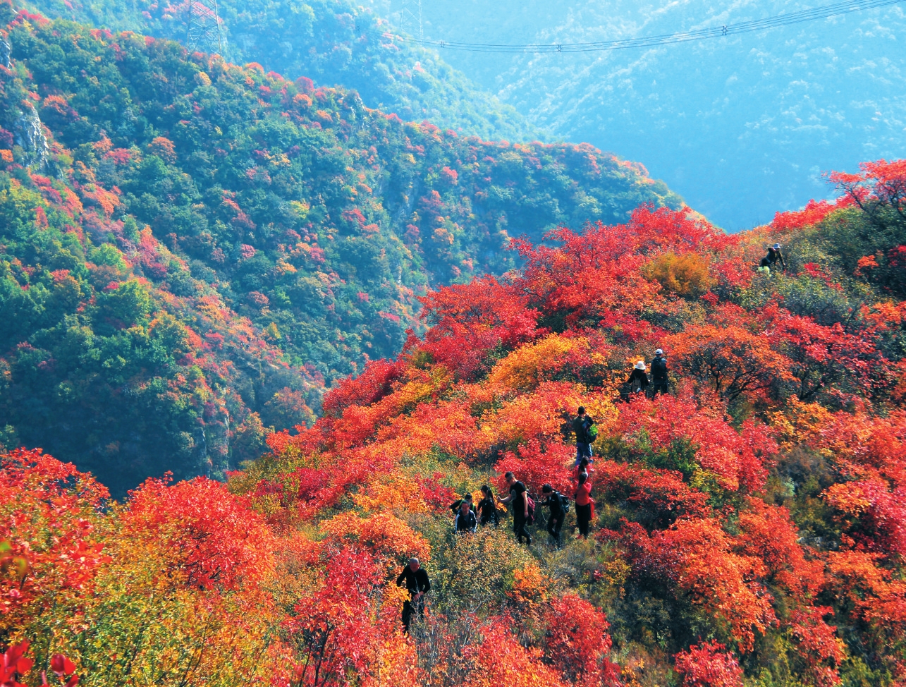 紅葉谷是一條長達十幾公里的狹長山谷,開闊處大如庭院,狹窄處頭頂只露一線天空。每到秋季,紅葉樹仿佛約好似的于山谷間競相爭艷,紅色或淺或深,紅綠相間、紅黃浸染,一片紅葉繽紛的世界。