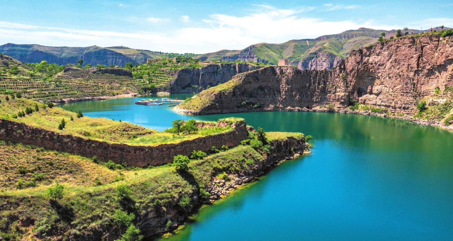 從磧口繼續(xù)下行,走過(guò)石樓灣、乾坤灣,黃河依舊清澈不染。站在山上看下去,深深峽谷里,黃河宛若一條綠色緞帶,溫柔盤旋于峽谷中。歷史上,黃河奔騰咆哮,穿高原,裂峽谷,卷泥走石,何其壯也!而今變?yōu)橐缓忧辶?,委婉如同一個(gè)小姑娘,這情景,讓人感覺(jué)有幾分夢(mèng)幻。