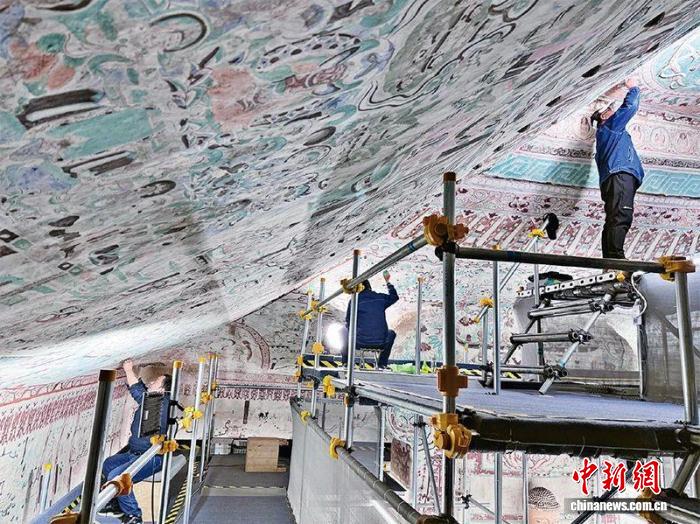圖為2024年拍攝的莫高窟第55窟文物修復(fù)現(xiàn)場。(資料圖,敦煌研究院供圖)