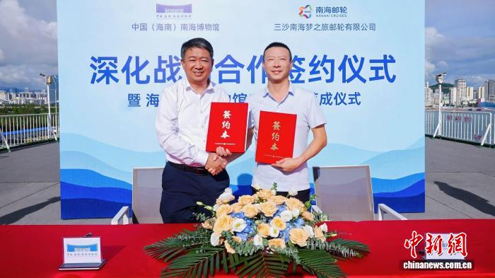 10月13日,全國(guó)首家海上流動(dòng)博物館升級(jí)改造落成儀式在三亞舉行。圖為中國(guó)(海南)南海博物館與三沙南海夢(mèng)之旅郵輪有限公司簽約。(三沙南海夢(mèng)之旅郵輪有限公司 供圖)