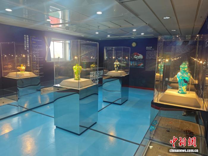 10月13日,全國(guó)首家海上流動(dòng)博物館升級(jí)改造落成儀式在三亞舉行。圖為“南海之夢(mèng)”號(hào)郵輪上全新推出的“深藍(lán)寶藏——南海西北陸坡一二號(hào)沉船考古成果特展”主題展覽。張?jiān)潞?攝