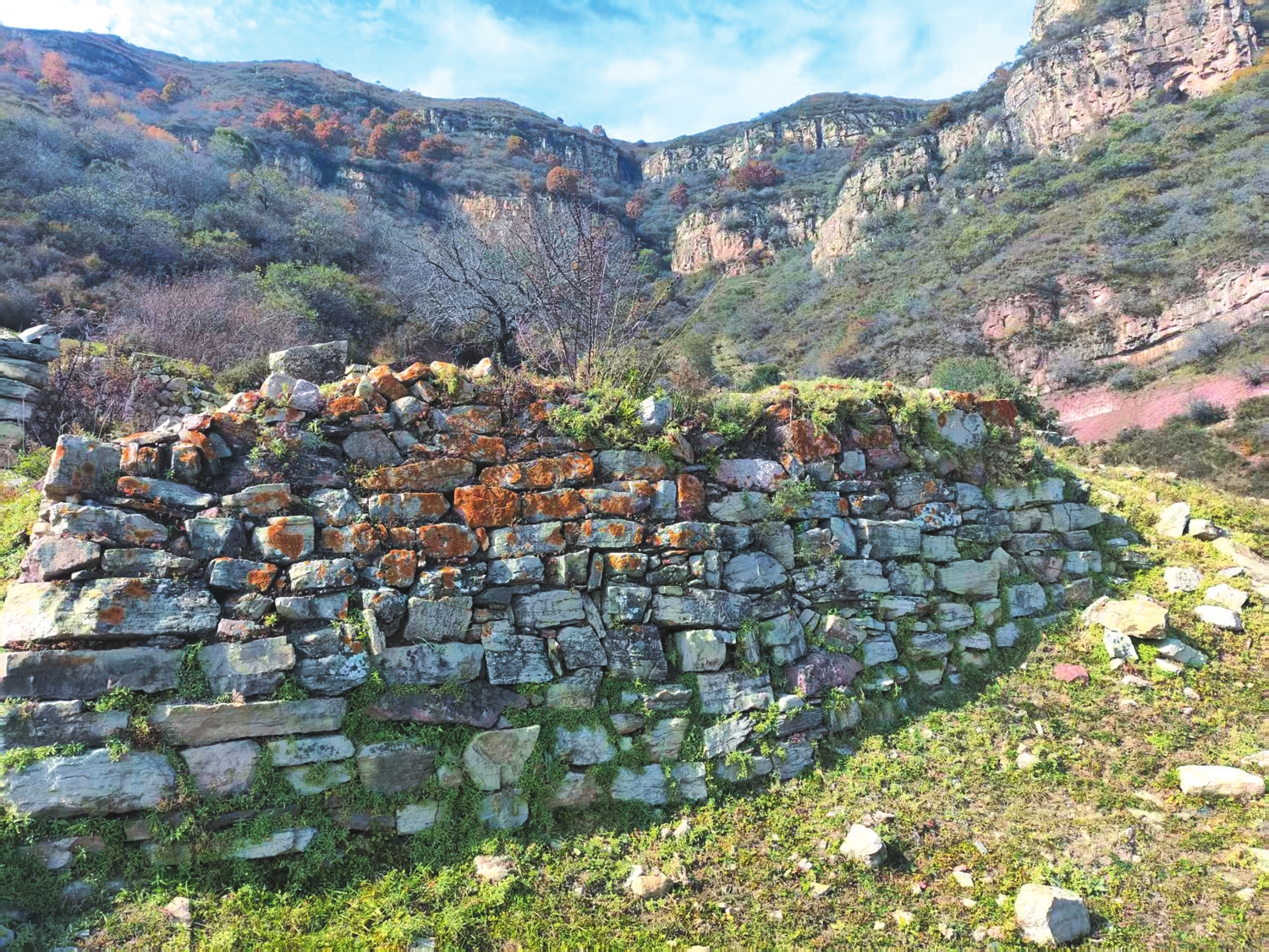 坡道在不斷升高,玉皇峁進入我們的視野。在玉皇峁的腳下,我們看到了一處貌似村落的遺址,有磚石瓦礫散落,有殘存的石砌墻垣,有石頭筑堰的小塊梯田……玉皇峁村是一個自然村,但不知建于何時,亦不知廢于何時。玉皇峁村的故事,早已消逝在千百年的煙云中,我們無法還原往昔歲月里的真相。
