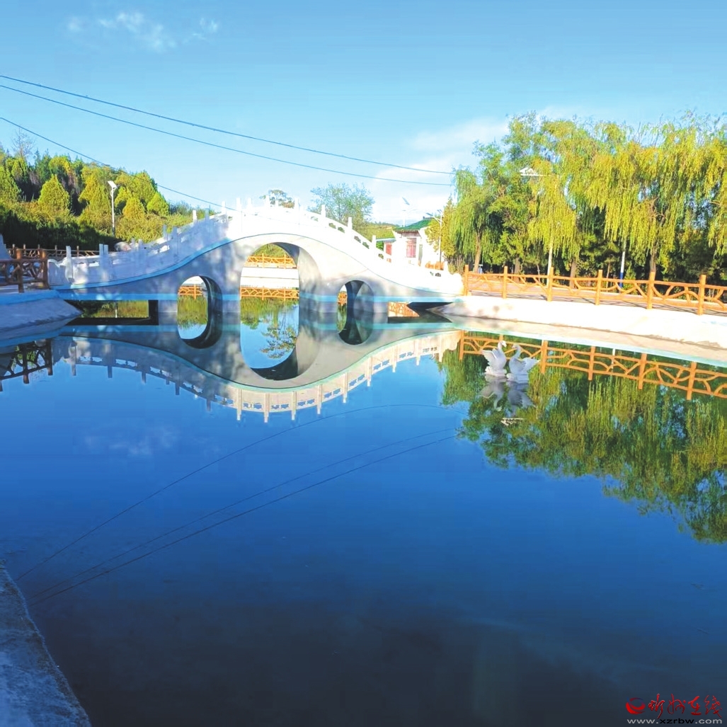沿路而下,過橋爬坡,便到了天鵝湖。誰能想到,這碧水涵虛的景致,原是當年造林蓄水的大水坑?工程完工后順勢修整,竟成飛龍山又一勝景。天鵝湖呈葫蘆狀,漢白玉拱橋橫跨腰間如玉帶,橋東石雕飛龍昂首欲飛,橋西石雕雙鵝戲水憨萌。湖水清澈見底,倒映藍天白云綠樹,風過時漣漪擴散,美得讓人心醉,連時間都慢了下來。