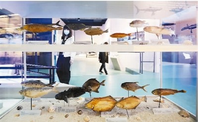 圖為參觀(guān)者在海洋展區(qū)一個(gè)魚(yú)類(lèi)標(biāo)本展柜前駐足觀(guān)看。新華社記者 方 喆攝