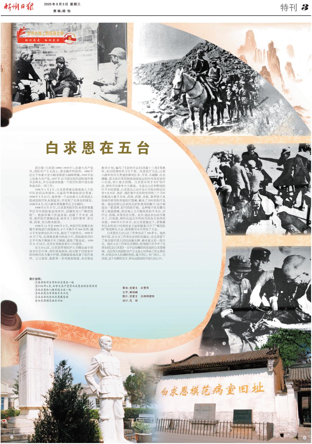白求恩在五臺山區(qū)工作和生活了100多天。他來到中國,在五臺工作和生活的時間最長,在這里留下了他支援中國人民抗戰(zhàn)最光輝、最有意義的一段歷史。他在五臺工作和生活期間,躬身踐行并升華了毛澤東《紀念白求恩》一文中總結概括的崇高的白求恩精神。這位偉大的國際共產主義戰(zhàn)士對革命工作認真負責,對同志對人民滿腔熱忱,毫不利己,專門利人。白求恩,這個光輝的名字,將永遠銘刻在中國人民心中。