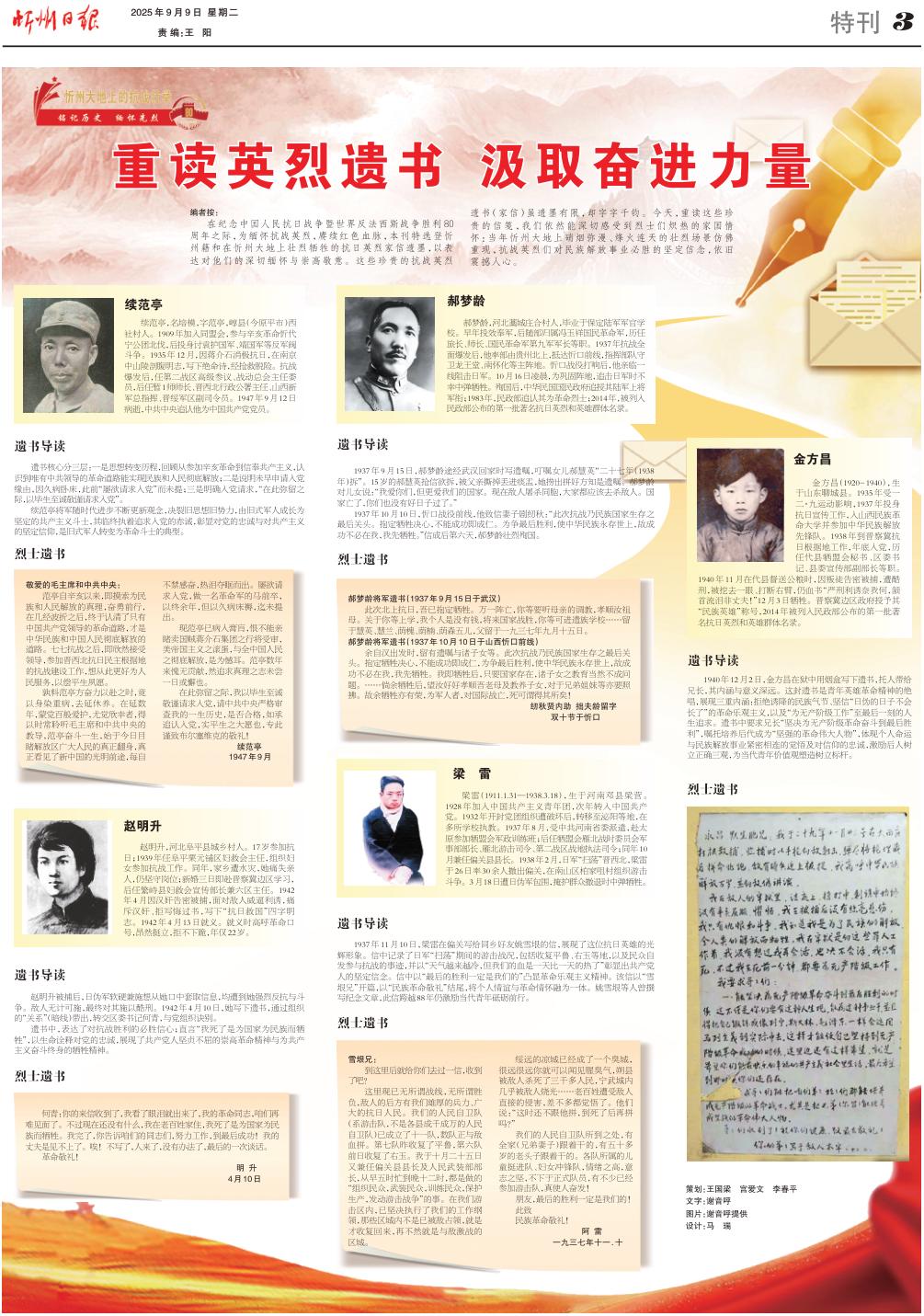 在紀念中國人民抗日戰(zhàn)爭暨世界反法西斯戰(zhàn)爭勝利80周年之際,為緬懷抗戰(zhàn)英烈,賡續(xù)紅色血脈,本刊特選登忻州籍和在忻州大地上壯烈犧牲的抗日英烈家信遺墨,以表達對他們的深切緬懷與崇高敬意。這些珍貴的抗戰(zhàn)英烈遺書(家信)雖遺墨有限,卻字字千鈞。今天,重讀這些珍貴的信箋,我們依然能深切感受到烈士們熾熱的家國情懷:當年忻州大地上硝煙彌漫、烽火連天的壯烈場景仿佛重現(xiàn),抗戰(zhàn)英烈們對民族解放事業(yè)必勝的堅定信念,依舊震撼人心。